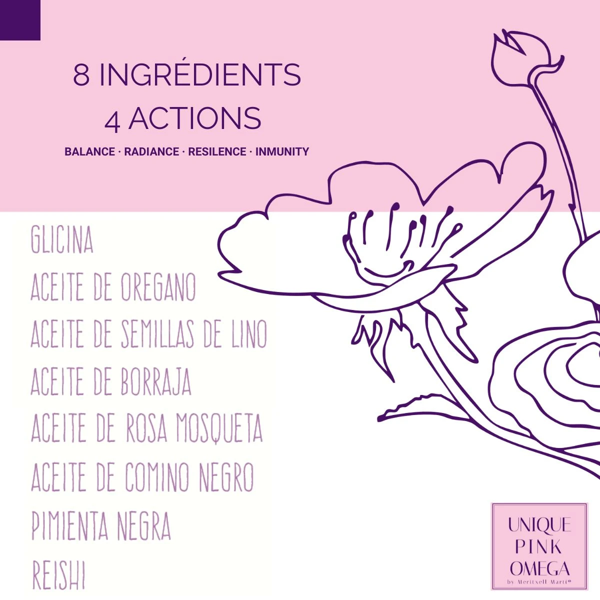 UNIQUE PINK OMEGA est le dernier né de la gamme UNIQUE de Meritxell Martí. Une formule capsule innovante qui associe des acides gras essentiels à de puissants extraits naturels et adaptogènes pour rétablir l'équilibre de votre corps. Beauté, sérénité et vitalité s'unissent dans une synergie unique conçue pour les femmes qui souhaitent prendre soin de leur peau, de leur bien-être intérieur et de leur énergie au quotidien.
